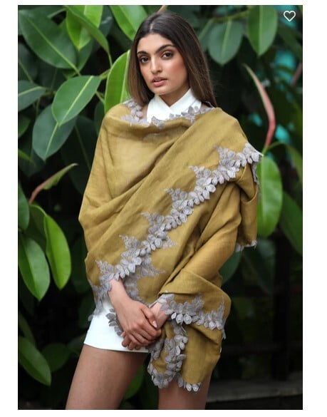 Shop this wispy mustard scarf, woven from a linen and modal blend, features a contrasting mousse bold scalloped edging lace border from Maneesha Ruia. A chic and fashionable add-on to any casual outfit.