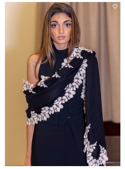 Shop this black scarf features a contrasting beige bold scalloped edging lace border from Maneesha Ruia. This chic and contemporary accessory keeps you stylishly warm.