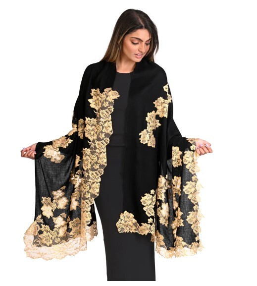 Black Cashmere Scarf with Gold Chantilly Lace – Maneesha Ruia